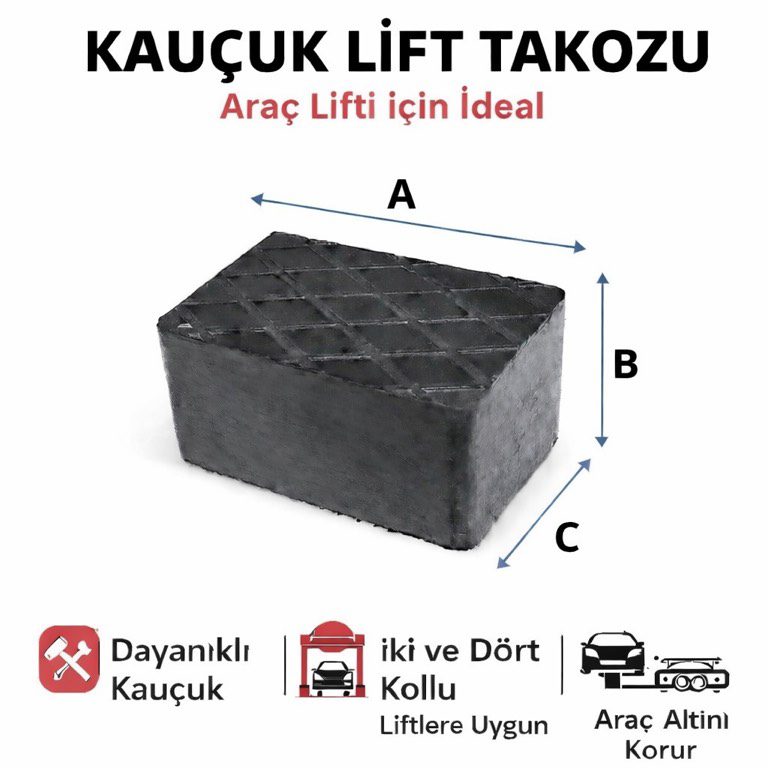 Kauçuk Lift Takozu, oto servisleri ve araç bakım istasyonlarında kullanılan kaldırma liftleri için özel olarak üretilmiştir. Aracın şasi ve kaldırma noktalarını koruyarak güvenli, dengeli ve kaymaz bir kaldırma sağlar.
