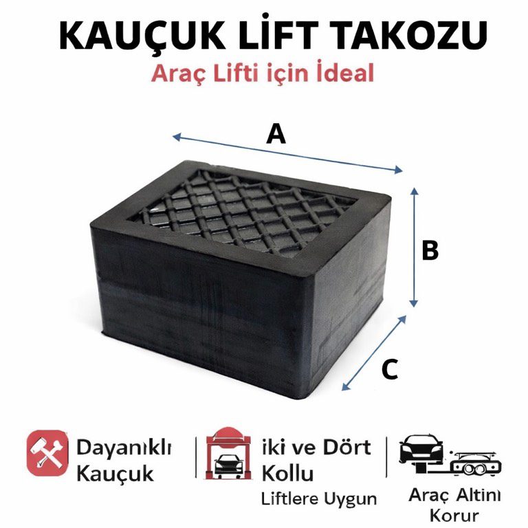 Kauçuk Lift Takozu, oto servisleri ve araç bakım istasyonlarında kullanılan kaldırma liftleri için özel olarak üretilmiştir. Aracın şasi ve kaldırma noktalarını koruyarak güvenli, dengeli ve kaymaz bir kaldırma sağlar.